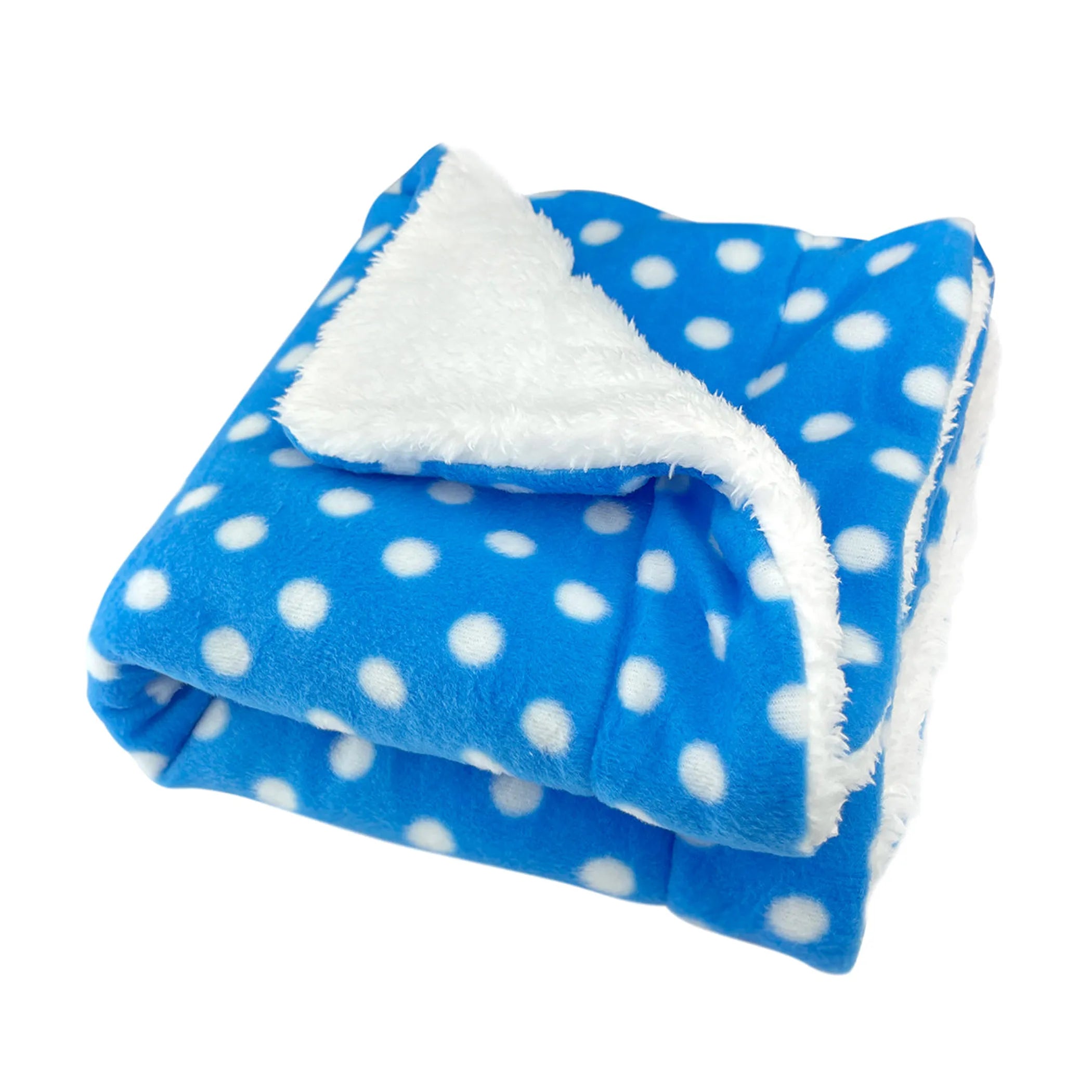 Double layered soft fleece in blue background with white polka dots pattern with ultra-soft plush back side.  Perfect match with Klippo's Polka Dots DINO Fleece Bodysuit/Pajamas.  One Size: 30"W x 20"H