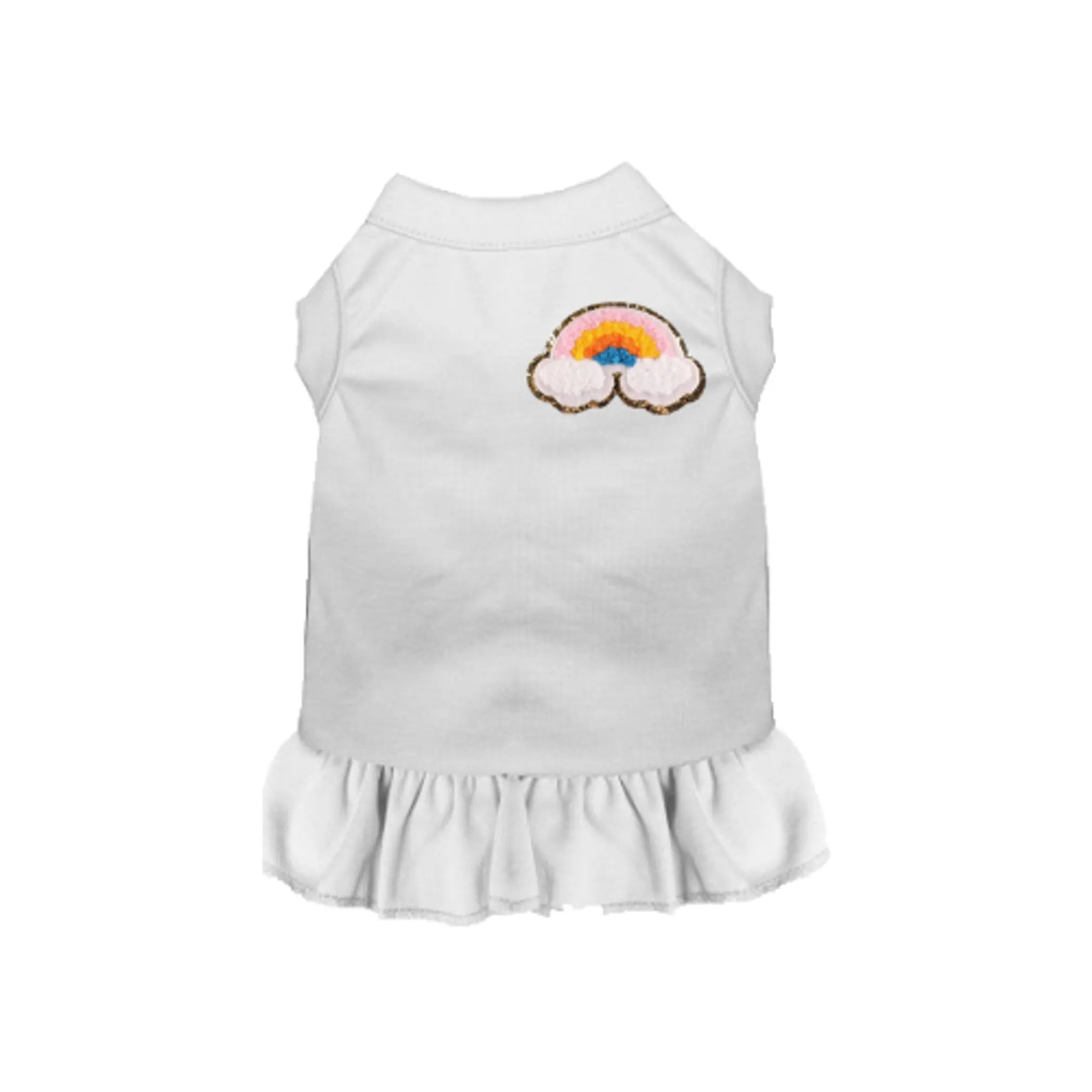 ADORABLE poly/cotton sleeveless shirts & dresses! The dresses have a ruffle sewn onto the bottom giving these outfits some adorable flair! Double-stitched in all the right places to provide not just durability, but a level of comfort that dogs will appreciate. Plus, they are pretty fabulous! Features a Chenille Embroidered Gold Glitter Edge Rainbow which is chic and delicate.