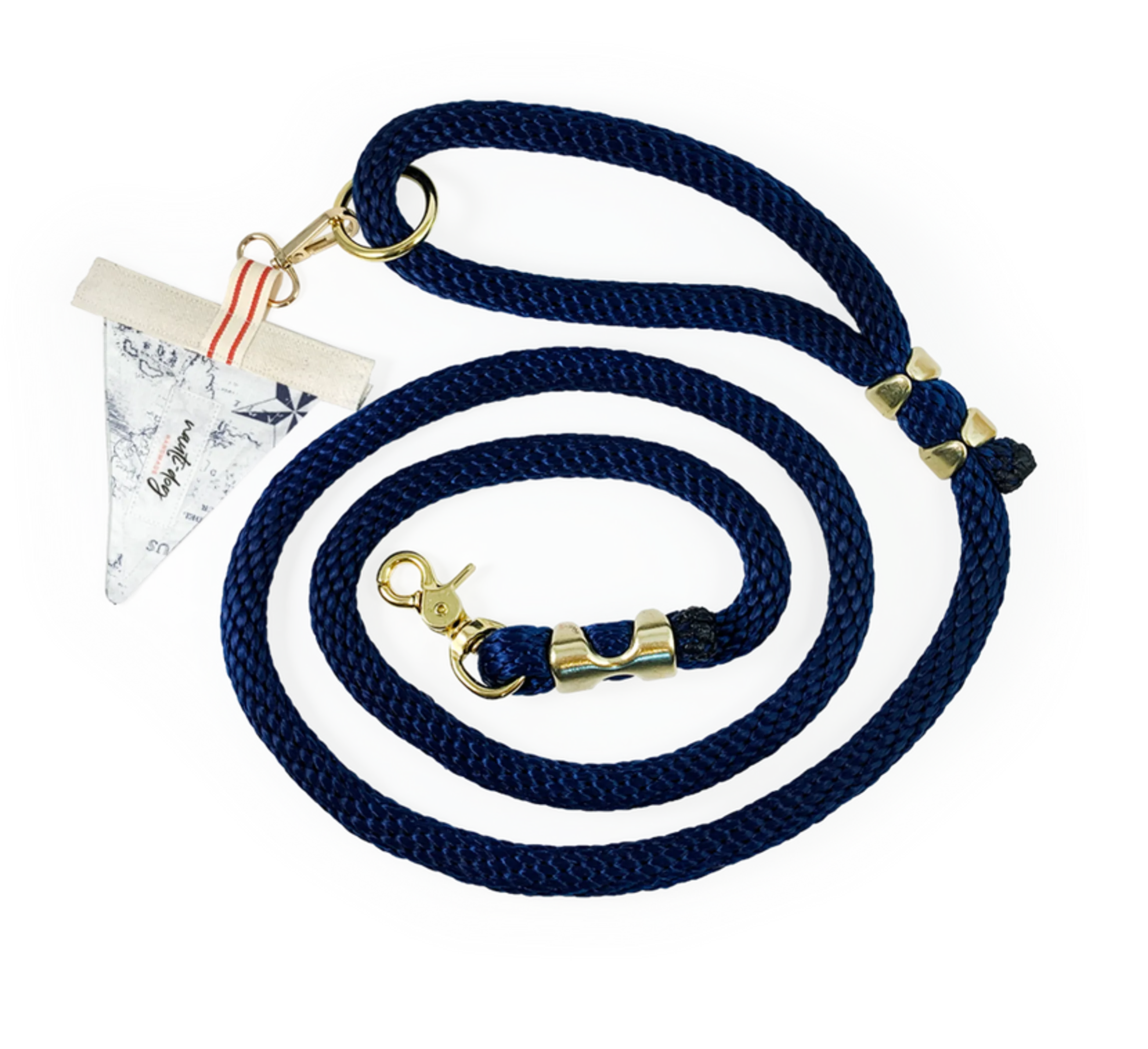 This premium navy lead features our vintage nautical map fabric flag. Our premium leashes are handmade from durable 5/8?EUR super soft braided polypropylene and features solid brass hardware. A handy hardware ring on the handle keeps your Nauti-dog Handmade waste bag dispenser and wrist lanyard right within reach during trips out and about. Don?EUR(TM)t forget to make your nauti-pup?EUR(TM)s new look complete with a complimenting collar and bandana-style collar cover accessories!