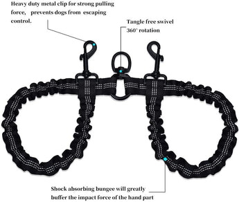 Tired of struggling to walk two dogs? Constant different direction pulls and tangled leashes. The dual bungee add-on will eliminate these issues and return your walk back into a peaceful and pleasurable event. The bungee add-on provides extra cushion while maintaining controlled movement and 360-degree rotation at all connection point eliminate leash tangling.