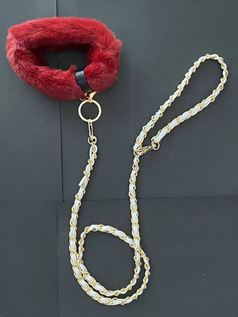 Keep warm while walking your pup this winter! This leash is nothing less than fabulous chic! Featuring a warm faux-mink wristlet and a gorgeous leatherette ribbon interwoven in a gold chain.