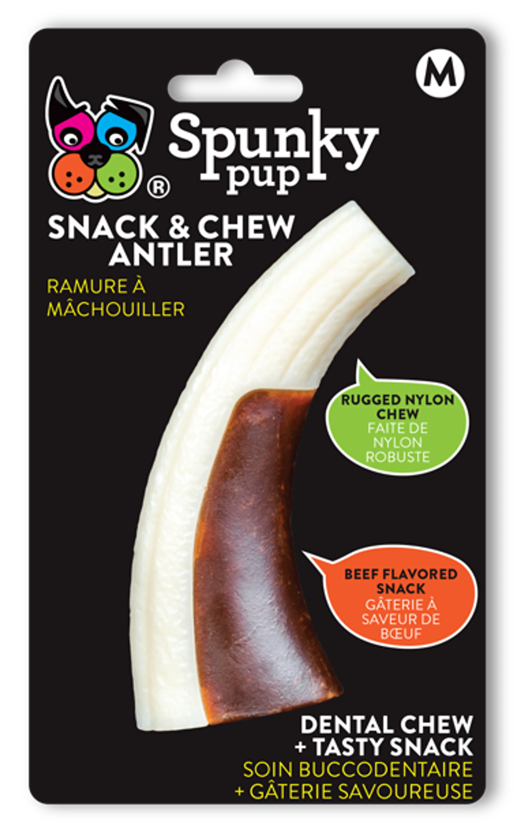 Your dog will love the Snack & Chew Antler from Spunky Pup! This 2-in-1 toy is made from rugged nylon with an embedded, beef-flavored treat.