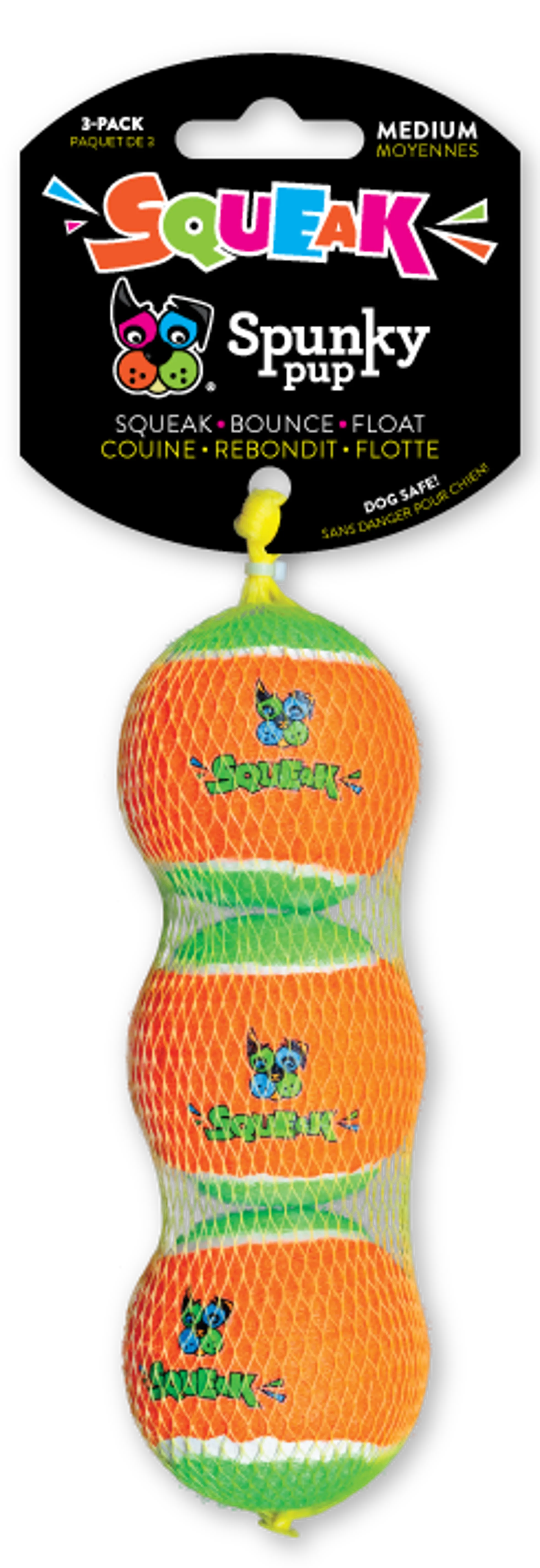 Squeaky tennis balls by Spunky Pup feature a durable embedded squeaker.