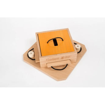 Length: 11.00 Width: 11.00 Height: 3.00 Trouble This is a challenging interactive game for dogs where their parent can easily control level of difficulty from 1 paw to 4 paws. It's recommended for medium and large size dogs. Trouble requires high level of dexterity and mental exercise and stimulates physical activity of your pet . A cube-shaped box with a lid is placed on a wooden base. There are two slits in the side walls with two tiles inserted inside of them . Each tile has a pull for easy removal from the slit by dog's mouth. Inside of the box the tiles are locked by "cylinders", under which the treats are placed. They need to be removed in order to slide the tiles out of the box and reach more treats placed on the floor of the box. The base has two additional "cylinders" placed on the sides where more treats are waiting to be discovered. According to dog's behaviorists 15 minutes of mental stimulation with employment of interactive game equivalents to 1 hour of physical exercise. This is especially important for the dogs living in large cities where long walks are difficult and impossible , senior dogs with ailments that do not allow them for prolong outings and those living in cold climates where going outside can put animal's health at risk. How to play this game: 1. Hide your dog's favorite treats under "Hats" and "cylinders" as well as inside of the drawers. Make sure your dog observes while you are doing it. 2. Encourage verbally your dog to seek the treats hidden inside of the puzzle. 3. The dog will start searching for the treats by knocking down the "cylinders", moving the "hats" to the position that they can be lifted and opening the drawers, where you hid the goodies. 4. Do praise the dog each time he/she solves the task - this motivates them to play as much as the smell of their favorite treat. Tip: Since it is quite difficult game to play, we suggest you start to use it with only one tile blocked with two "cylinders". Gradually, as she or he learns how to move the parts add additional tile and "cylinders" to increase the level of difficulty. As with any interactive puzzle make sure to stay all the time with your dog while he is solving it, being an active witness to his achievement. Additional information: Dimensions: 13"x12"x5" Weight: 4lb All our games and puzzles are made from certified wood covered with water-based varnish that is not harmful to humans and animals. Please keep the game dry and free of water exposure, as the wooden pieces may swell otherwise. Use only dry treats for playing with our games Keep out of reach of small children since removable parts can be a choking hazard to them.