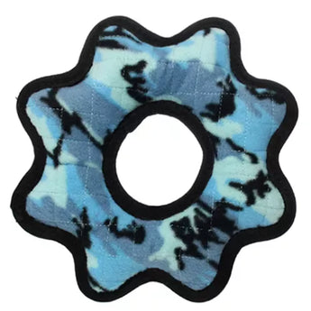 Tuffy Ultimate Gear Ring Camo Blue. Great for interactive play with one or multiple dogs. Best for dogs who like to whip their toys and play tug for hours. Floats in water, and its machine washable, (air dry). 4 LAYERS OF MATERIAL Tuffy Ultimate toys are made with UP TO 4 layers. 1 layer soft fleece on the outside. 1 to 2 layers of industrial grade luggage material on the inside. 1 layer of plastic coating on the inside.